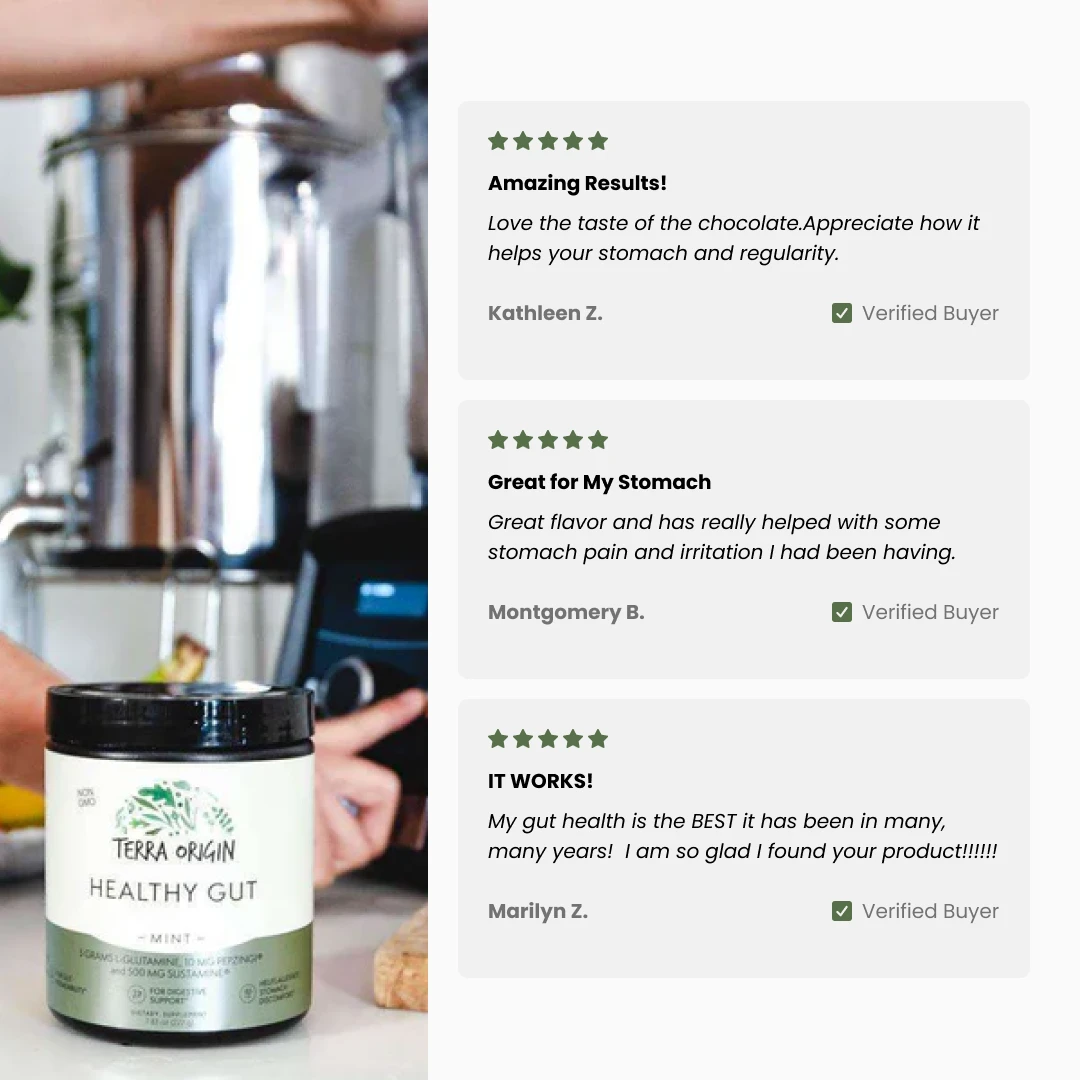 Healthy Gut is a daily gut support powder that helps reduce bloating, smooth digestion, and boost comfort. Powered by L-Glutamine, PepZinGI®, and soothing herbs, it helps you feel lighter and more energized every day.